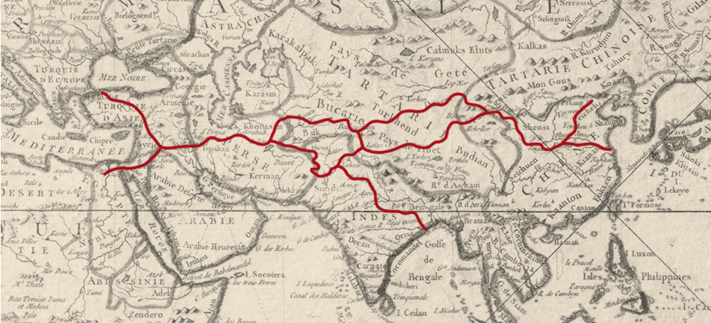 مسیر جاده ابریشم بعد از برج سنگی ( برج سنگی نام مکانی به عنوان مرکز تلاقی کاروانهای تجار چینی در کشور چین است) به فلات پامیر، شهر بلخ، مرو، هرات، طوس، شهر ری در فلات ایران، همدان، بغداد، حلوان، فرات، شهر هیراپولیس و سپس به بندر انطاکیه میرسیده است.